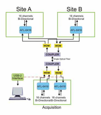 AFL-6400 可配寘爲遠程數據採集係統,在 PC 站點上使用 USB2 接口,在遠程站點上使用 AFL-6400。兩箇站點之間的距離可能長達 50 公裏。